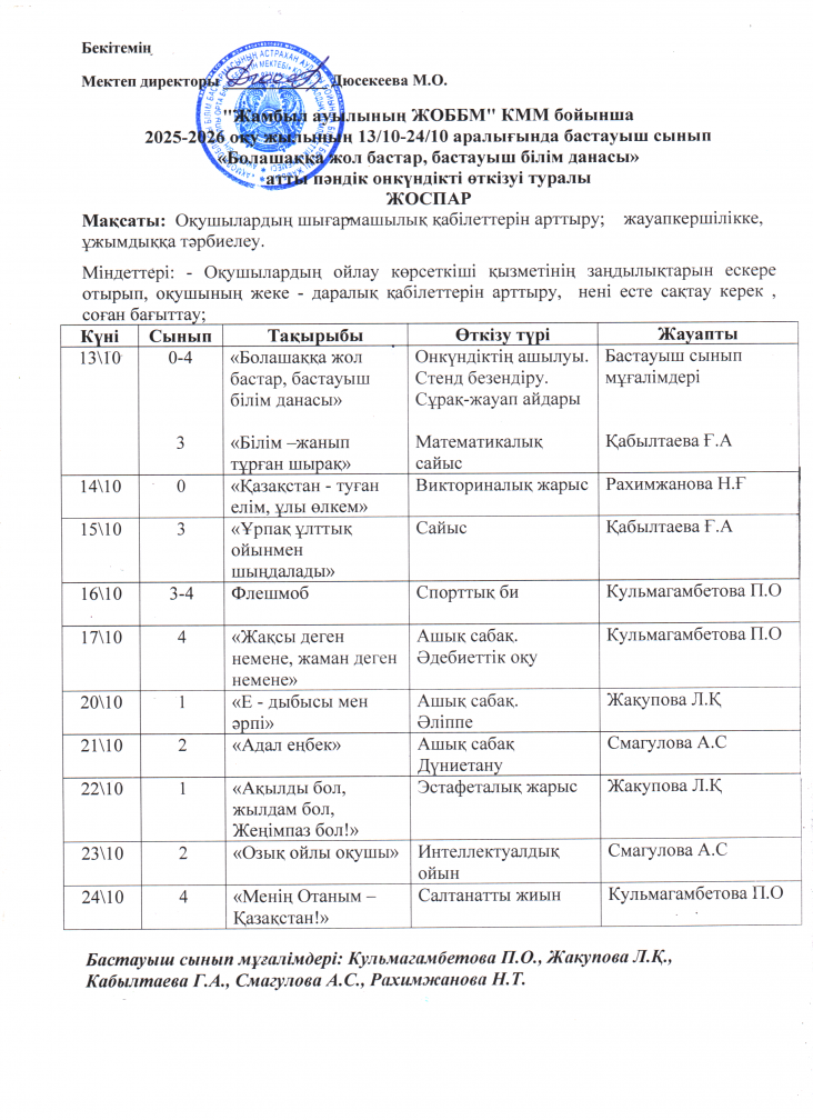 "Жамбыл ауылының ЖОББМ" КММ бойынша 2025-2026 оқу жылының 13/10-24/10 аралығында бастауыш сынып «Болашаққа жол бастар, бастауыш білім данасы» атты пәндік онкүндікті өткізуі туралы ЖОСПАР