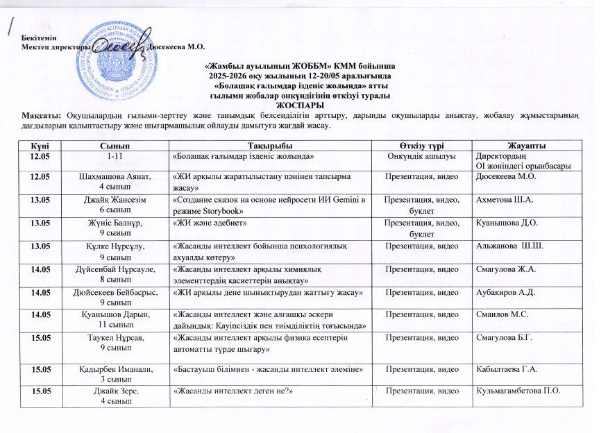 «Жамбыл ауылының ЖОББМ» КММ бойынша 2025-2026 оқу жылының 12-20/05 аралығында «Болашақ ғалымдар ізденіс жолында» атты ғылыми жобалар онкүндігінің өткізуі туралы ЖОСПАРЫ